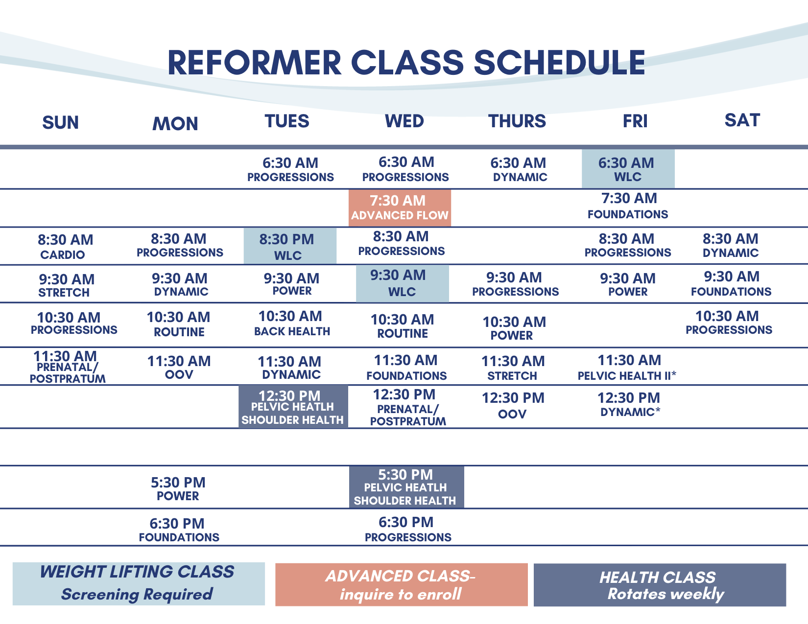 Weds 12:30 pm + Sun 11:30 am